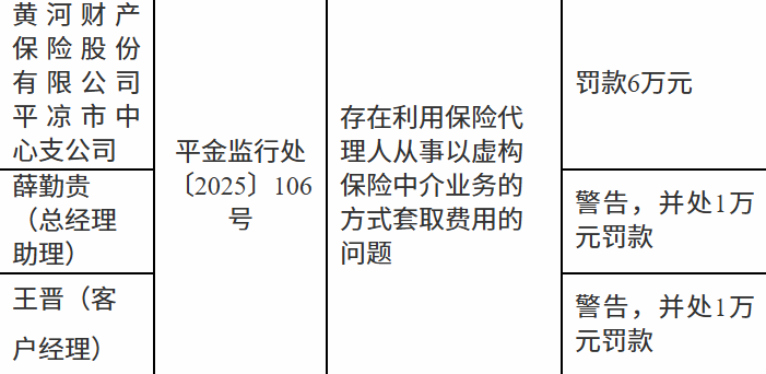 1月4日,国家金融监督管理总局平凉监管分局行政处罚信息公示表显示,黄河财产保险股份有限公司平凉市中心支公司因以虚构保险中介业务的方式套取费用的问题被罚款6万元;薛某贵、王某被警告并罚款1万元。