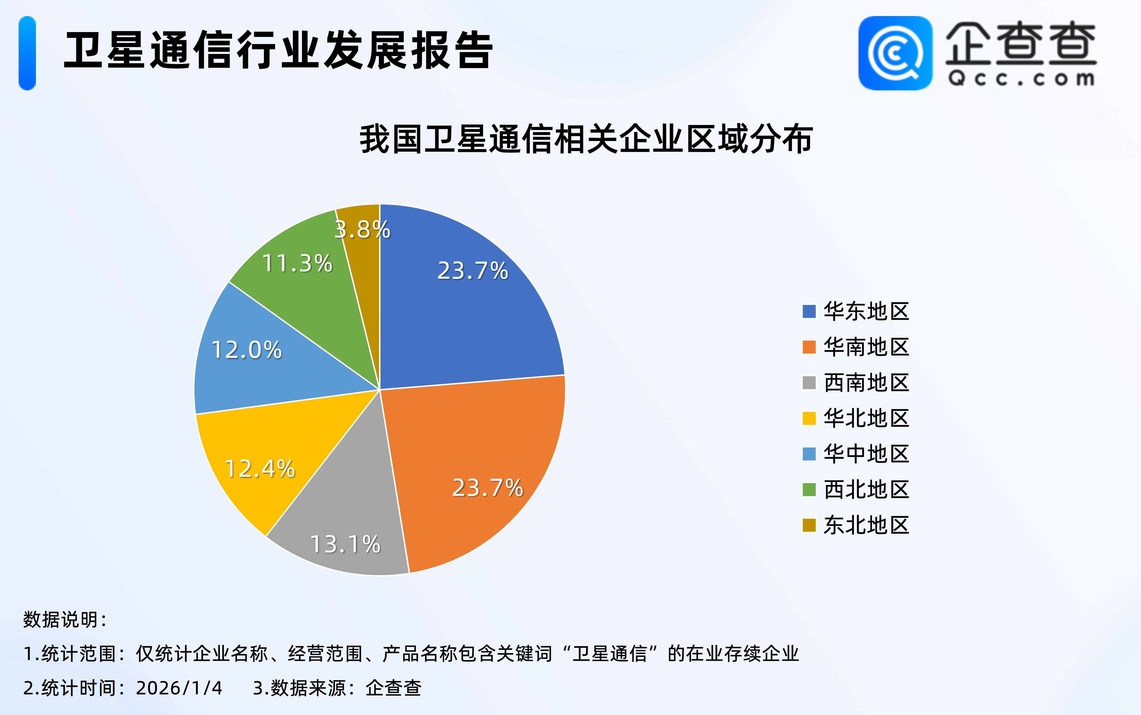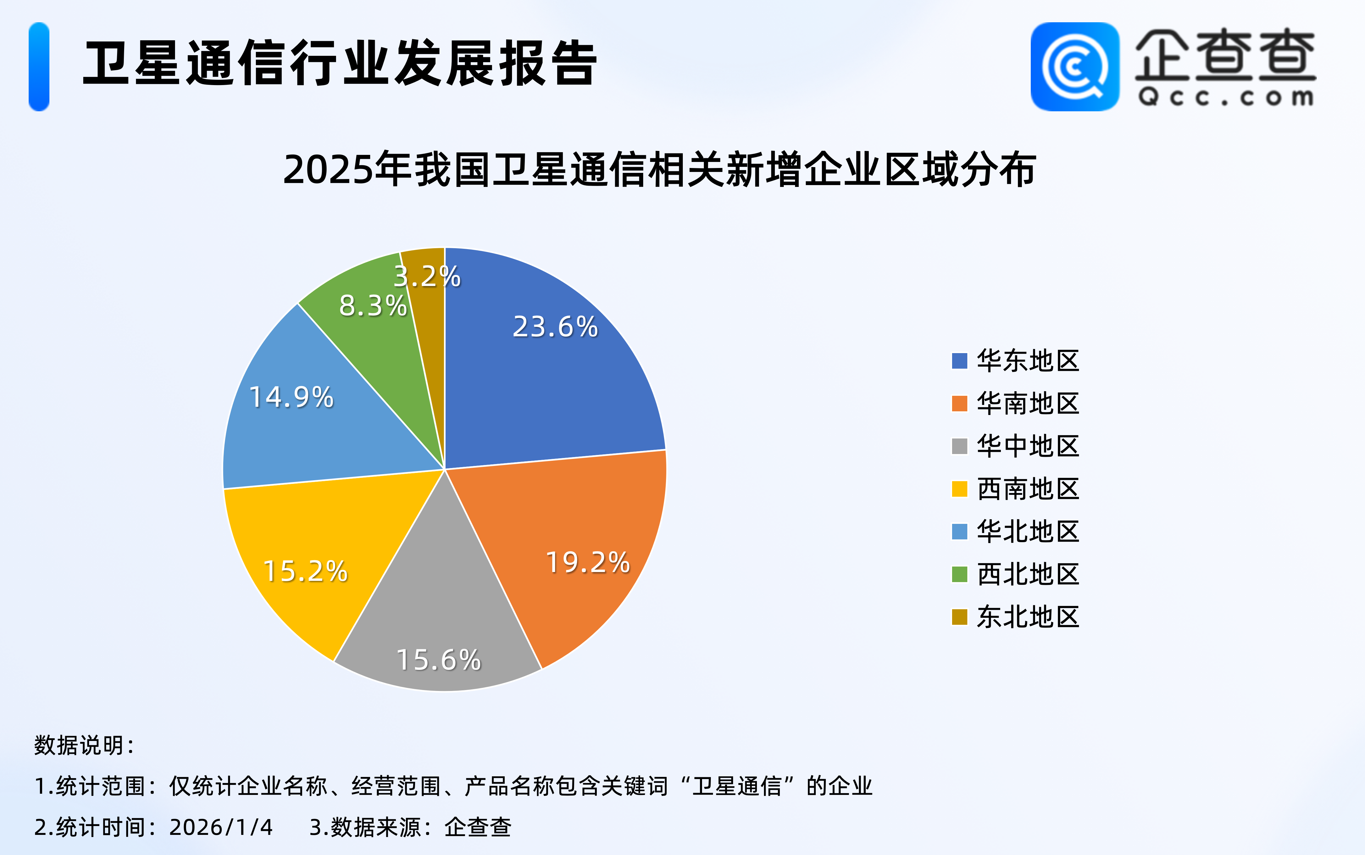 近日,国家国防科工局党组理论学习中心组召开扩大会议。会议提出,要促进商业航天发展,推动航天产业化。此前2025年12月26日,上交所发布《商业火箭企业适用科创板第五套上市标准指引》,标志着商业火箭企业登陆资本市场的通道正式打通、标准全面明确。根据《中国商业航天产业研究报告》的数据,2025年以来我国完成航天发射87次,其中民营商业火箭企业执行23次,成功入轨航天器324颗。应用场景持续拓宽,中国电信披露截至2025年11月,支持直连卫星功能的手机终端销量超2500万台。随着卫星物联网商用试验启动、可回收火箭技术迭代,空天地一体化通信网络加速成型,为数字经济发展注入强劲动能。企查查数据显示,截至1月4日,我国现存6.18万家卫星通信相关企业,区域分布上,以华东、华南地区为主,合计占比47.4%;注册量方面,2025年全年,我国累计注册1.56万家卫星通信相关企业,创近十年注册量新高,同比增长48.6%。区域分布上,与存量区域分布不同的是,今年华中地区卫星通信相关企业注册量占全国总量的15.6%,超过西南、华北地区,成为2025年卫星通信相关企业注册量第三大区域。1.从企业存量来看:华东、华南地区合占47%
