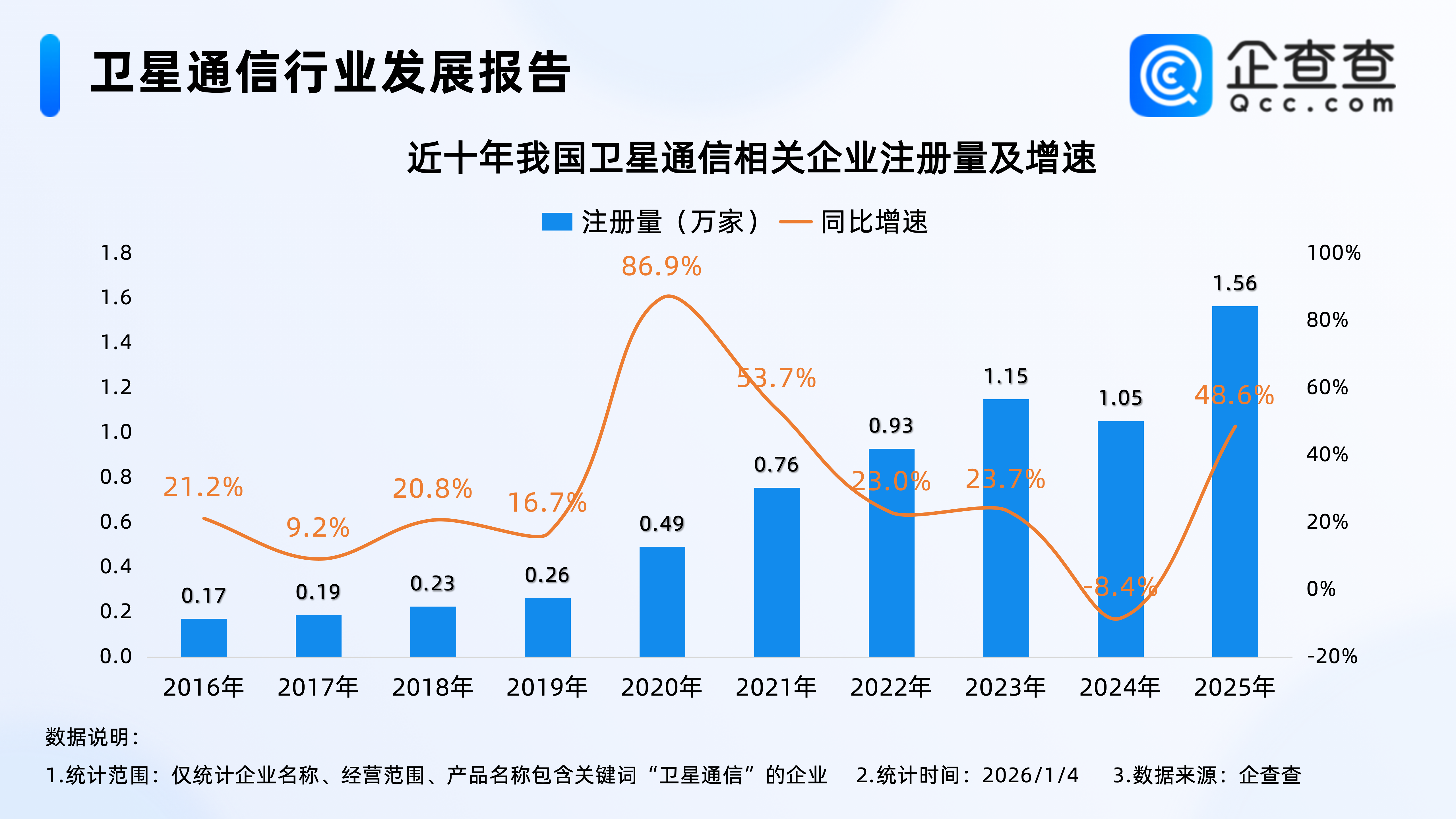 企查查数据显示,截至1月4日,我国现存6.18万家卫星通信相关企业,区域分布上,华东、华南地区均现存1.5万家卫星通信相关企业,合计占比47.4%,其次是西南地区,占比13.1%。2.从注册量来看:2025年注册1.56万家,同比增长48.6%