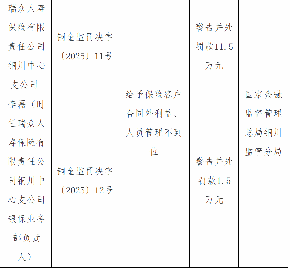 奇侠优配APP下载 瑞众人寿铜川中心支公司因给予保险客户合同外利益等被罚款11.5万元 奇侠优配APP下载 来源:粤友钱配资平台 网站:股票在线配资 日期:2026-04-18 15:16:38 查看:91
