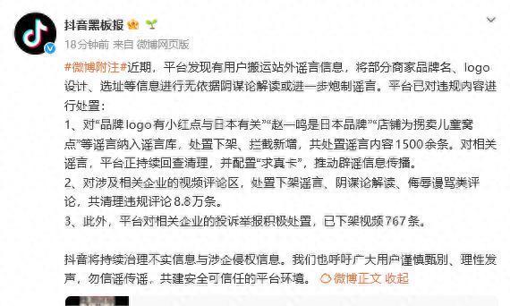 据该公告披露,平台发现部分用户搬运并传播来自站外的谣言信息,对“赵一鸣零食”等品牌的品牌名、logo设计、店铺选址等信息进行毫无依据的阴谋论解读甚至二次炮制。其中,诸如“品牌logo有小红点与日本有关”、“赵一鸣是日本品牌”、“店铺为拐卖儿童窝点”等言论被明确列为谣言,并已纳入平台谣言库进行重点管理。平台不仅对存量违规内容进行下架处置,也加强了对新增信息的拦截,并通过配置“求真卡”等方式推动辟谣信息传播。